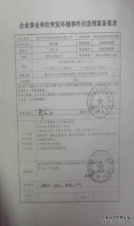 已制訂《惠州市東方杜邦紡織有限公司突發(fā)環(huán)境事件應(yīng)急預(yù)案》,并于2021年 4月12日在博羅縣環(huán)境保護局備案,備案編號:4413-2021-004-M |